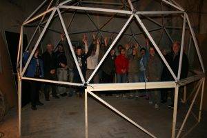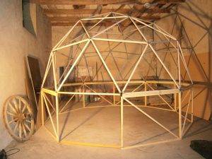 La base est un géodome  2V en tasseaux de bois 27×27 précédemment réalisé (voir l’épisode I) de 4.5m de diamètre. On rajoute  un socle en bois qui lève la structure de 1.2 m environ
