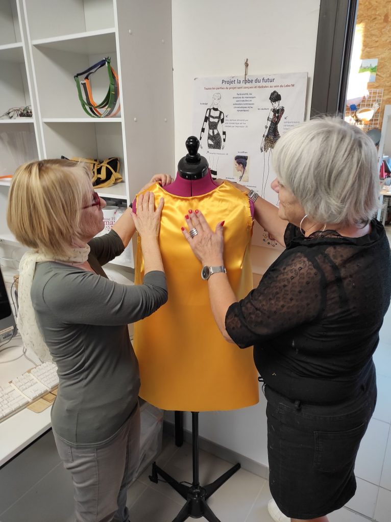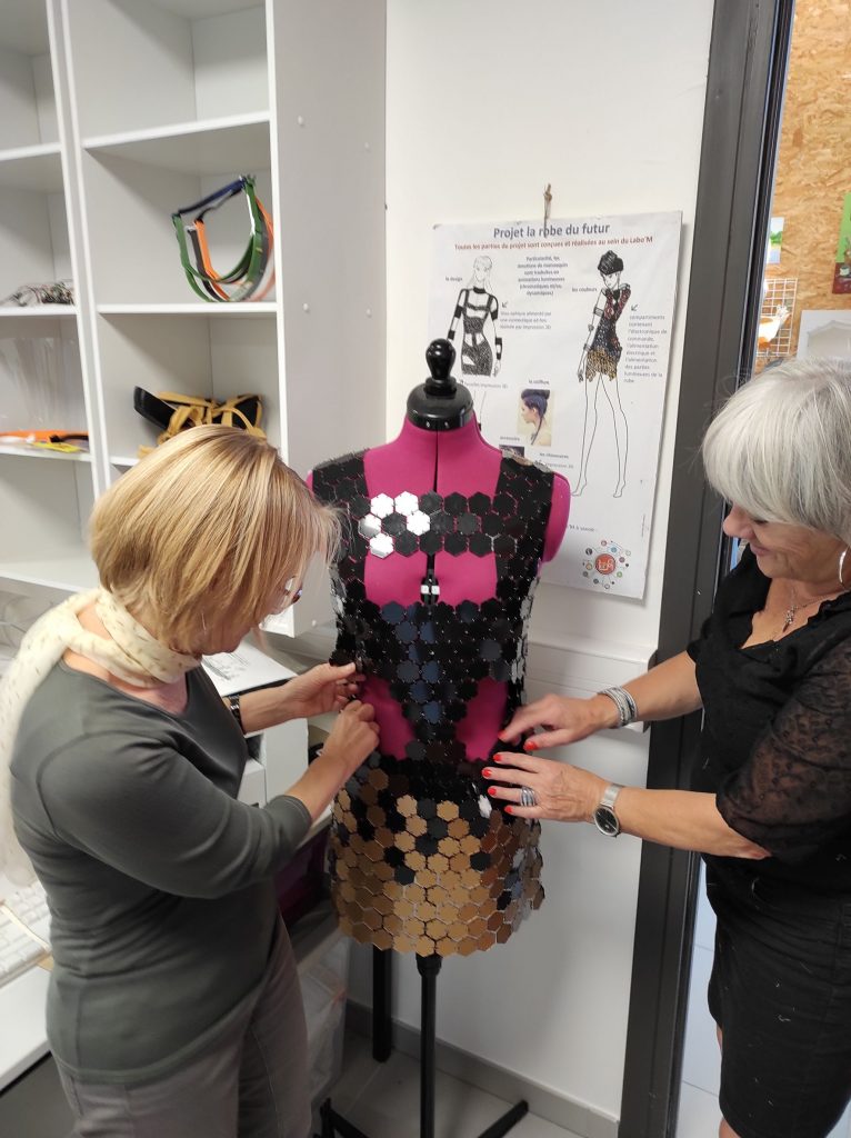La fabrication progresse. Aujourd’hui et les semaines qui vont suivre seront consacrées à la couture et l’ajustement du nouveau fond de robe (c’est Christine qui s’y colle) ainsi que la mise au point plus précise des tesselles sur le mannequin réglé cette fois aux mensurations de notre modèle (Evelyne à la pince et aux anneaux). Morgan avance de son côté sur les éléments lumineux et les tests sont concluants.